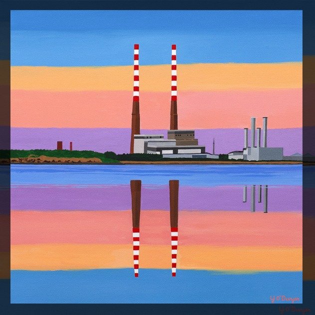 A daytime interpretation of the famous Poolbeg Chimneys, this artwork highlights their enduring presence as symbols of Dublin’s identity.